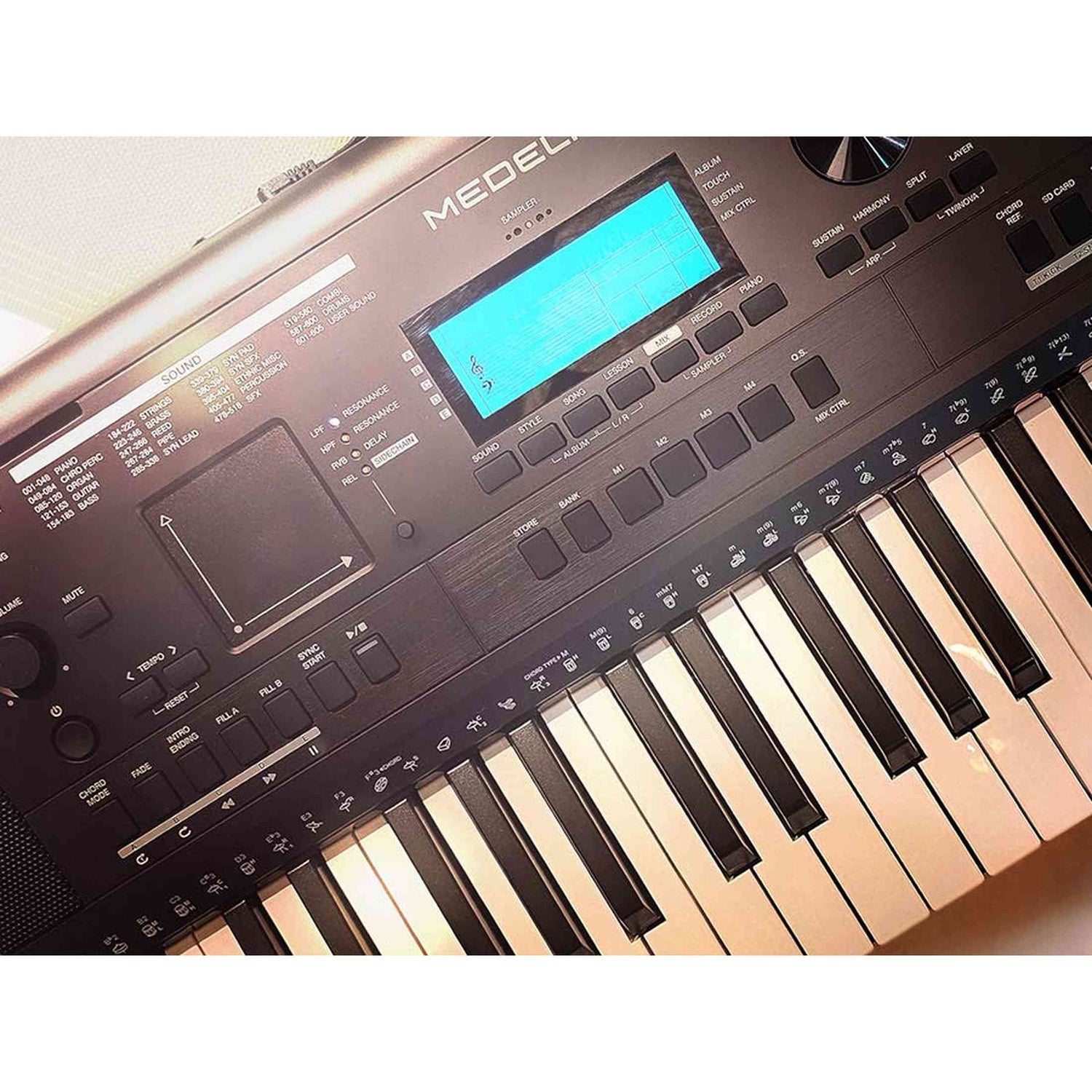 The XY pad lets you control filters, delay, or sidechain effects with a single finger for extra expression. The sampler is simple: record a vocal or sound via the built-in microphone and then play it across the entire keyboard. The Music Tutorial System helps you improve quickly. Thanks to powerful 2 x 15 watt speakers and convenient connections such as USB Audio/MIDI, SD card slot, and a sustain pedal input, the MK401 is also ready for live use and recording.