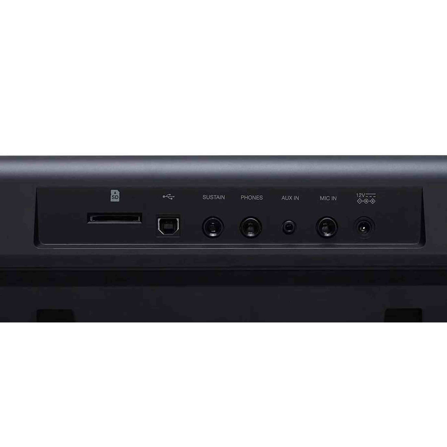 - Connections: DC power, USB MIDI / USB AUDIO, headphones/output (6.3 mm jack), input (3.5 mm jack), microphone (6.3 mm jack), sustain pedal (6.3 mm jack), SD card slot