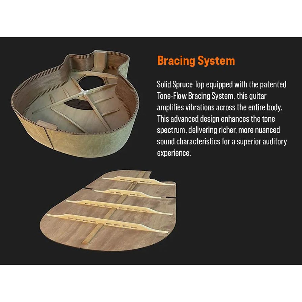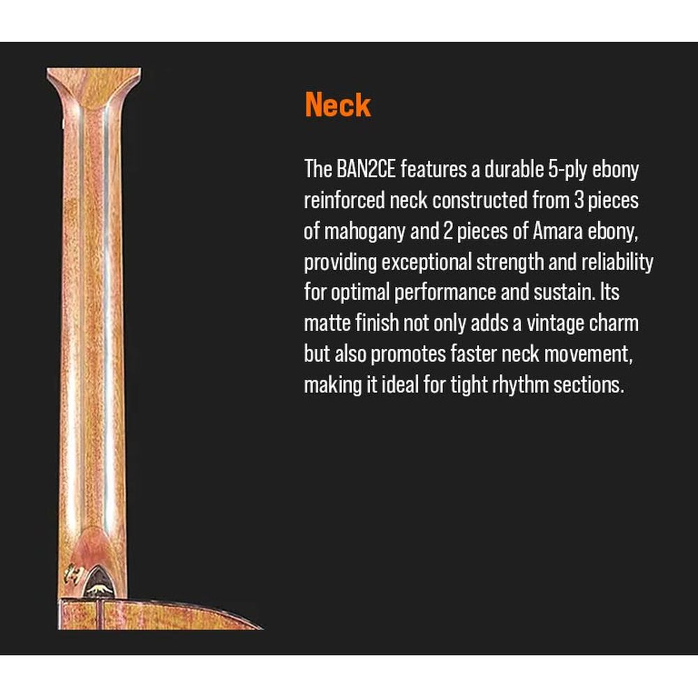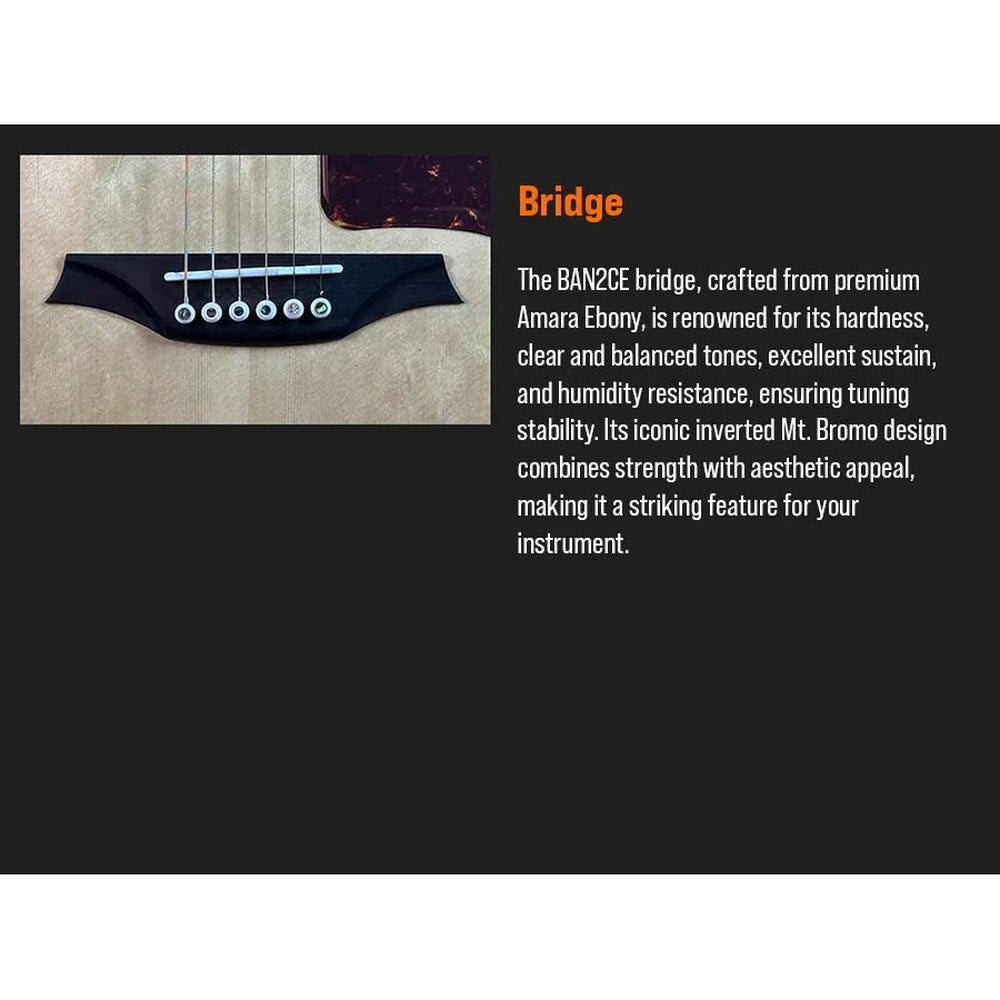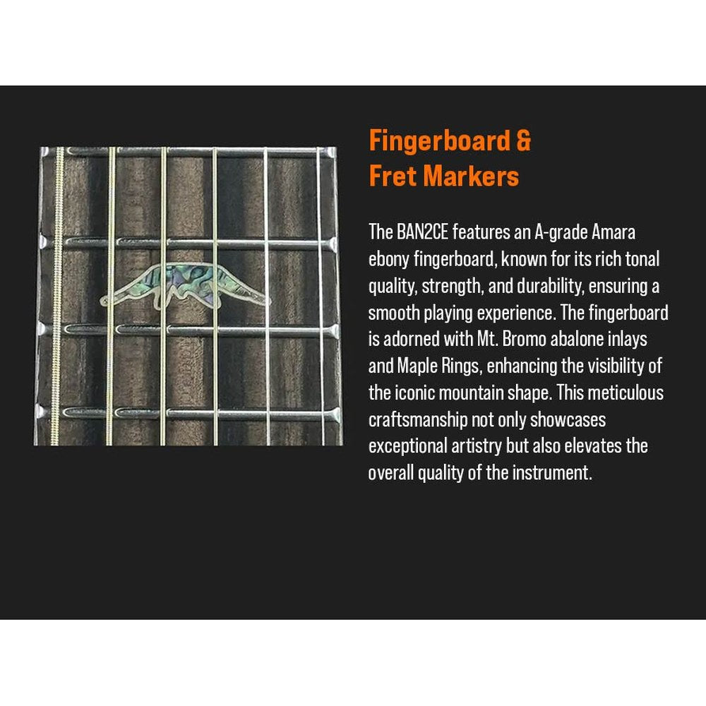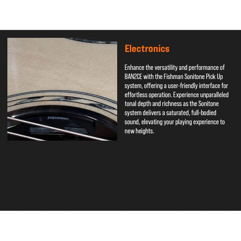 Featuring a solid spruce top and rare 5A Flamed Movingui back and sides, the BAN2CE delivers a rich, balanced tone with strong projection. Its patented ToneFlow bracing system maximizes resonance, while the slim mahogany neck with Amara ebony bracing and fingerboard delivers a smooth playing experience. Fishman Sonitone electronics make it easy to enhance the guitar's natural tone for live performance or recording.