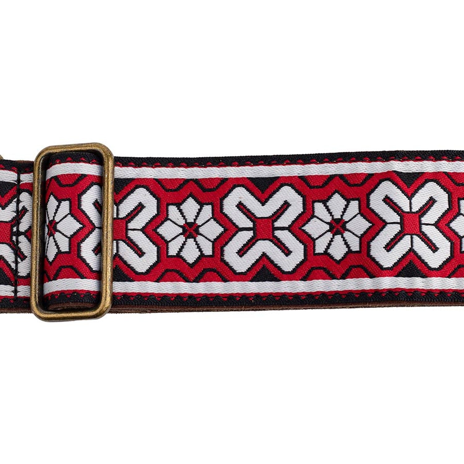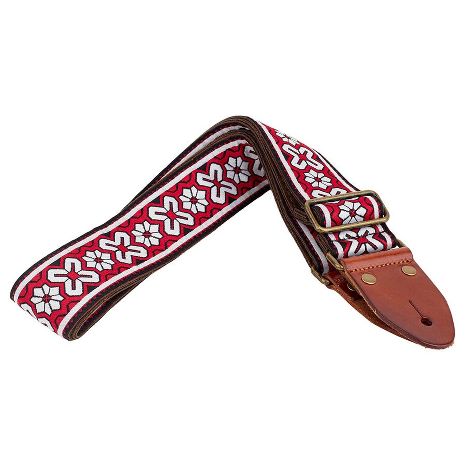 Guitar strap, 2" jacquard weave, leather ends with pins, brass buckle, suede back, red/white