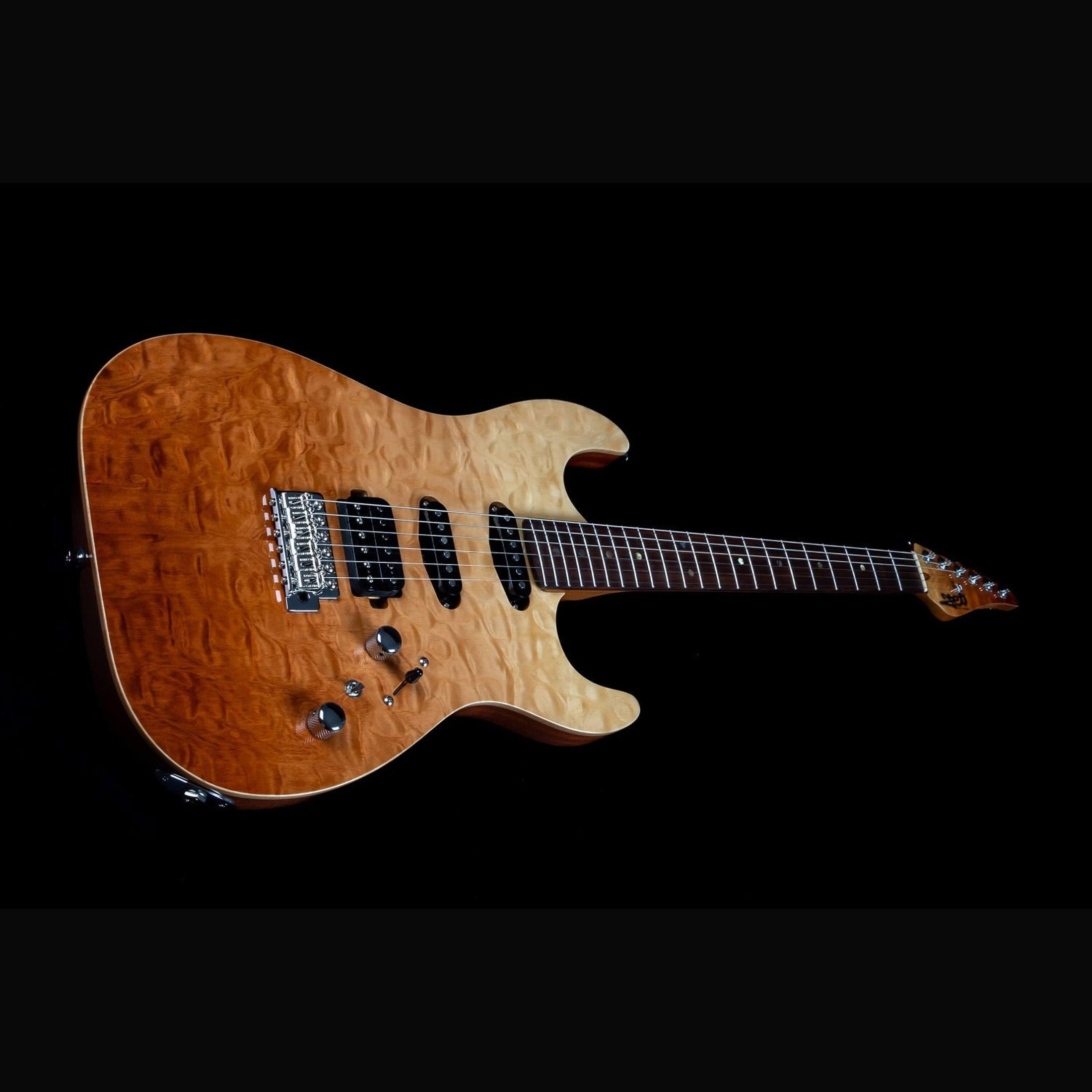 The HSS pickup configuration with Alnico pickups offers a wide range of tonal possibilities. The bridge humbucker delivers power and definition, while the two single-coil pickups deliver bright, sparkling tones. The 3-way switch and additional mini-switch allow you to quickly switch between pickup options. The Wilkinson WV6SB tremolo provides smooth vibrato, and the locking tuners keep tuning stable.
