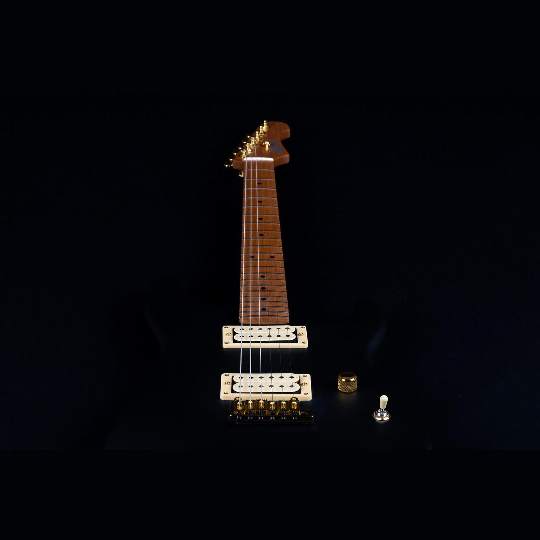 The guitar features two direct-mounted Alnico V humbuckers that deliver powerful output and a full tone. With the 3-way switch, you can quickly choose between bridge, middle, or neck positions. The Wilkinson tremolo allows for subtle vibrato, while the locking tuners keep the tuning stable. The matte black finish with gold hardware gives the guitar a sleek and distinct appearance.