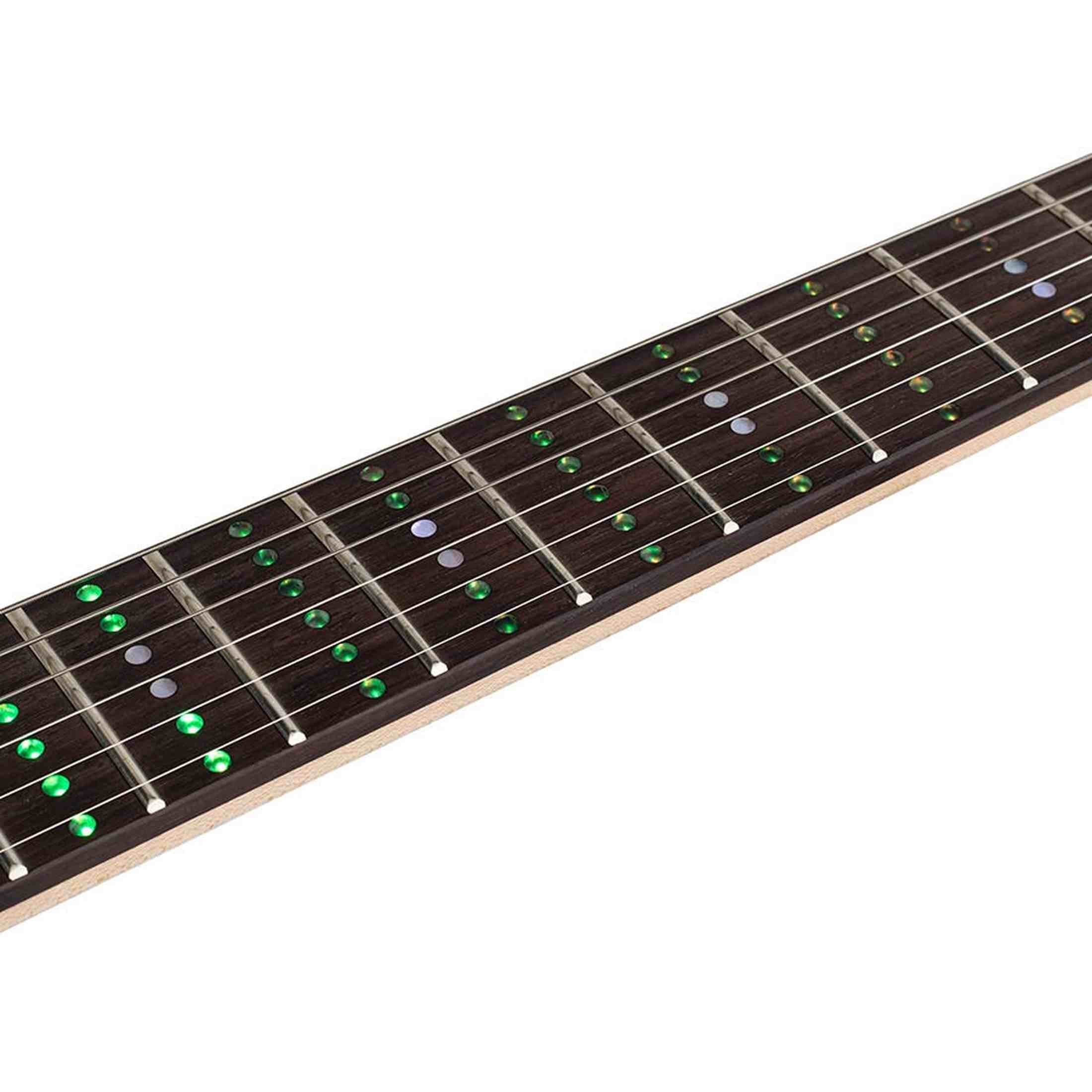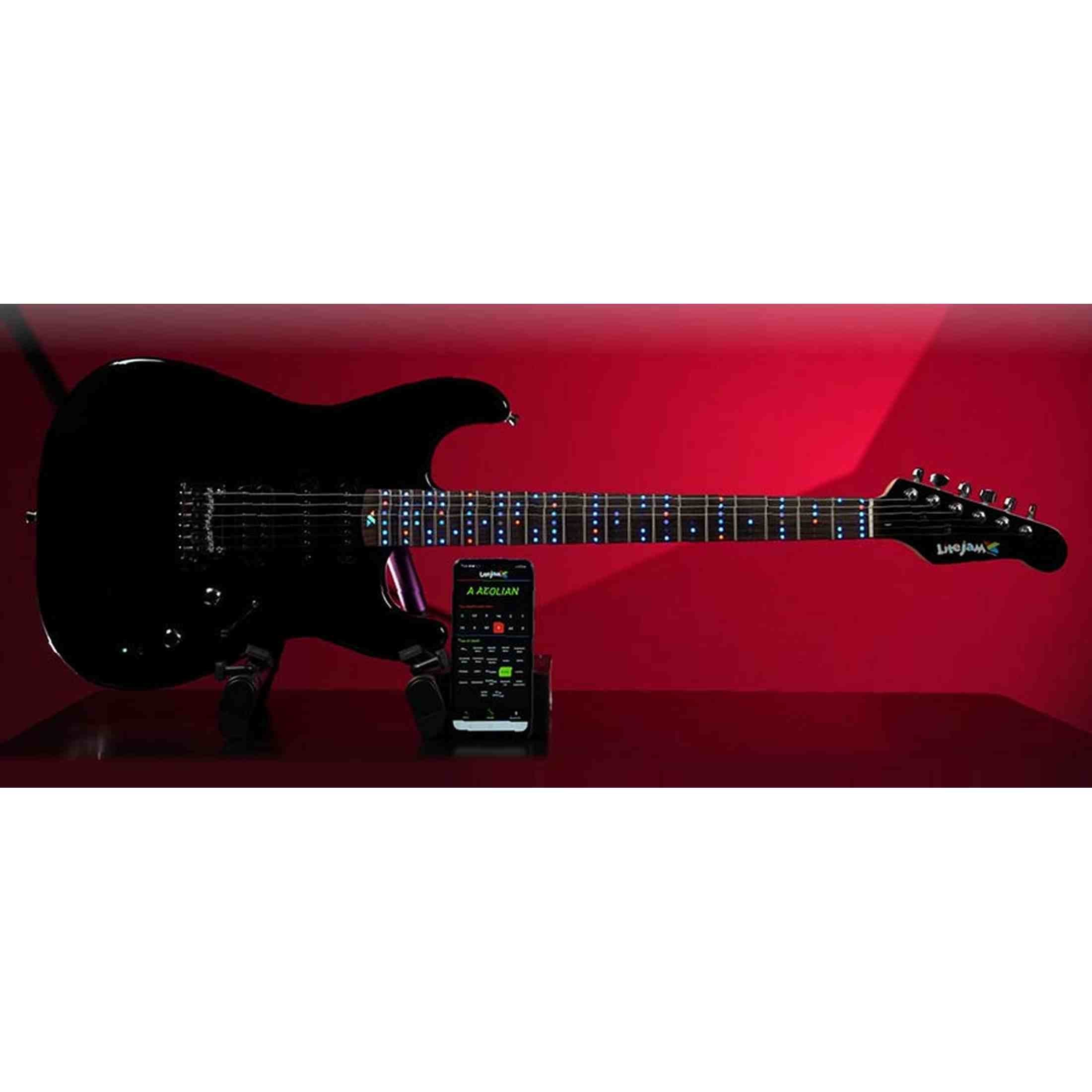 The Litejam RGB24/BK Smart Learning electric guitar is a complete set that lets you get started right away. The RGB LED fretboard works with the app to illuminate chords, scales, and tablature on the fretboard in real time. You can immediately see where to place your fingers, making practice clear and helping you progress faster. This is suitable for beginners and practical for lessons and visual study.