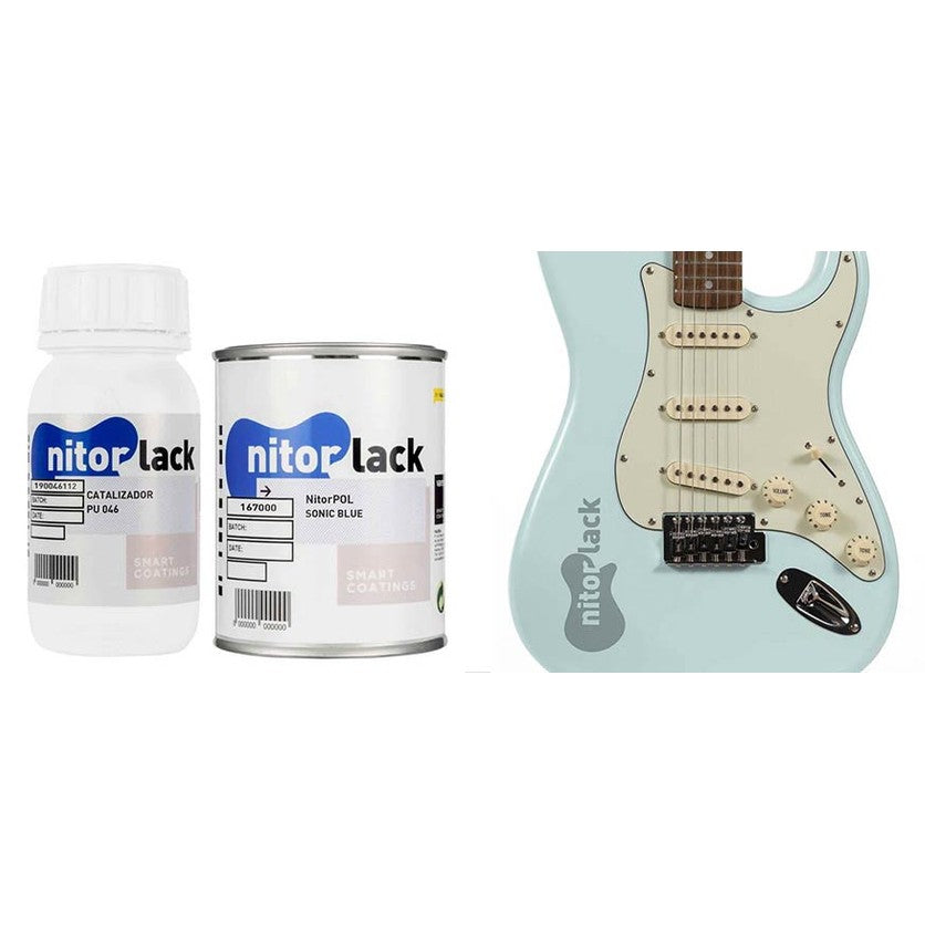 NitorLACK N167000108 is a dual-coat polyurethane lacquer in the color Sonic Blue , a classic vintage color originally used on the 1956 Cadillac (Duco 2295) and later became popular as a custom color on Fender guitars from 1960 to 1972. This soft, light blue shade gives the instrument a fresh, retro look that complements both modern and classic guitar designs.