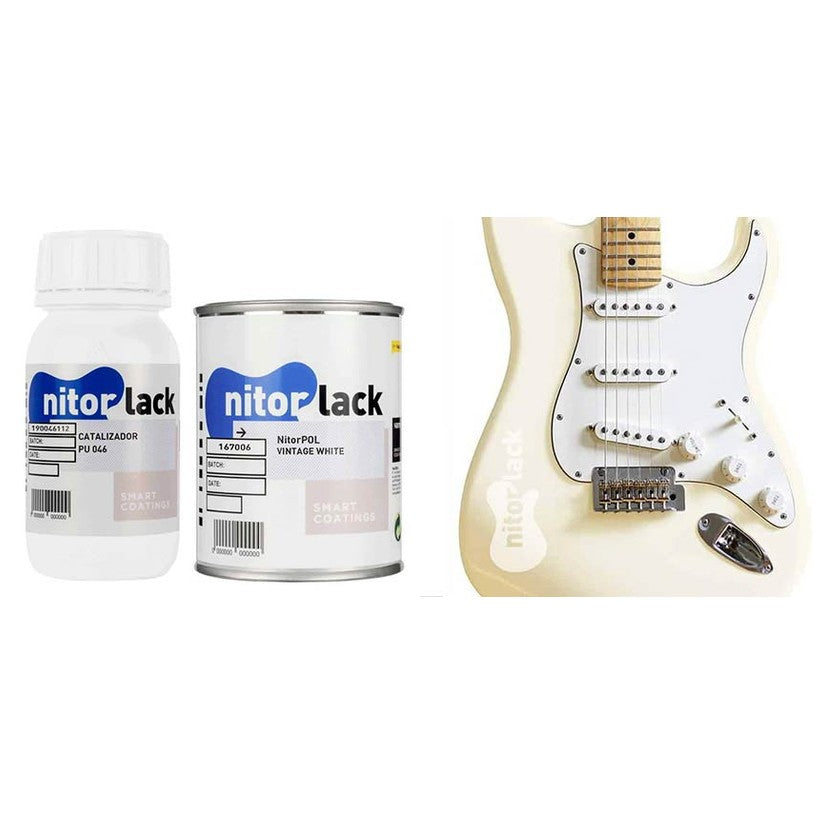 NitorLACK N167006108 is a dual-coat polyurethane lacquer in Vintage White , inspired by classic Fender guitars from the 1960s–1974 period. The color has a warm, yellow-cream undertone that mimics the aging effect of old topcoats. This opaque, pigmented lacquer is typically applied over a white base and is best finished with a clear topcoat for added protection and depth of color.