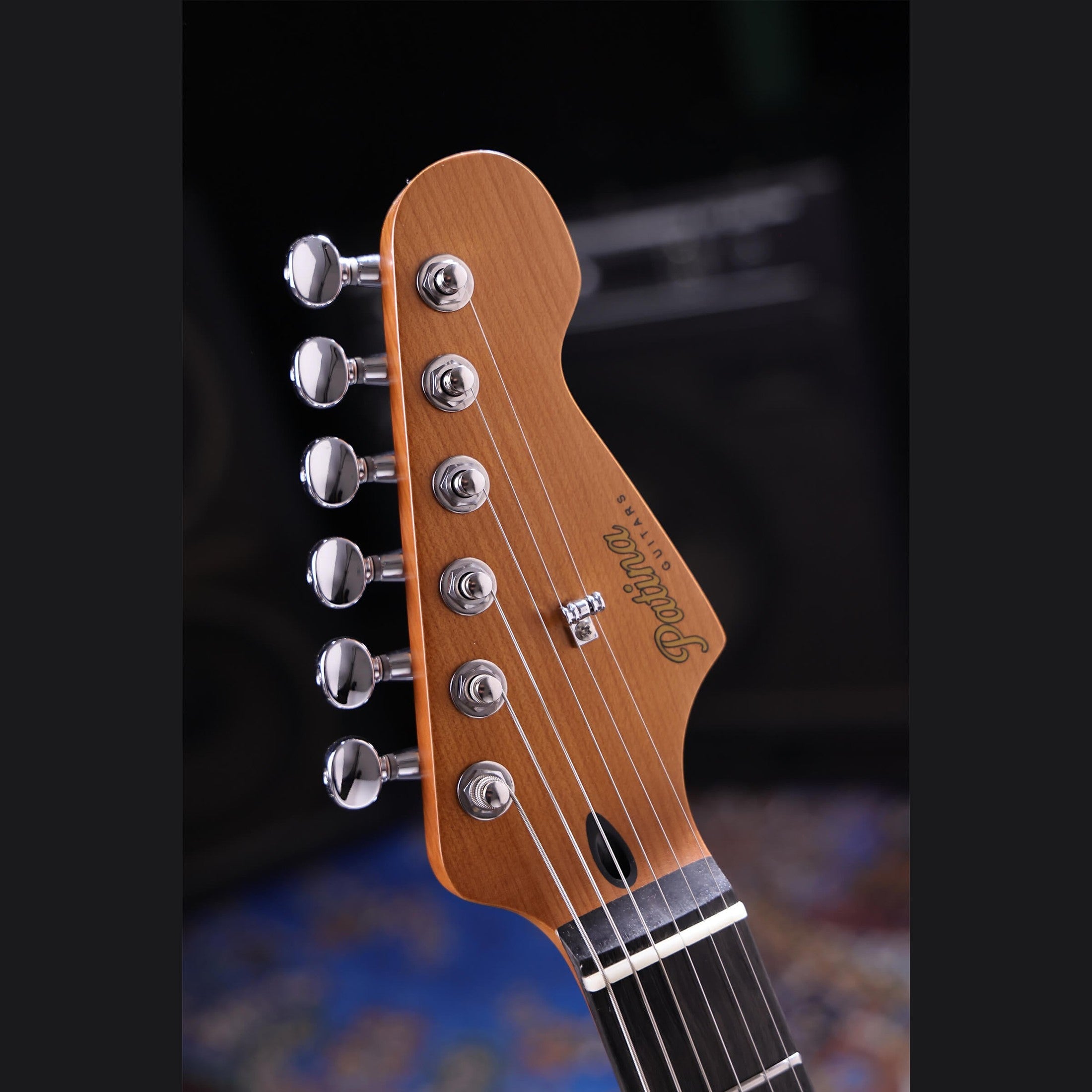 The lightweight paulownia body is finished with a nitrocellulose lacquer. This allows the wood to resonate freely and, over time, naturally wears, giving the guitar its distinctive character. The quarter-sawn roasted maple neck with a rosewood fingerboard feels instantly comfortable. Stainless steel jumbo frets are durable, and the locking tuners help maintain tuning stability, even with heavy tremolo use.