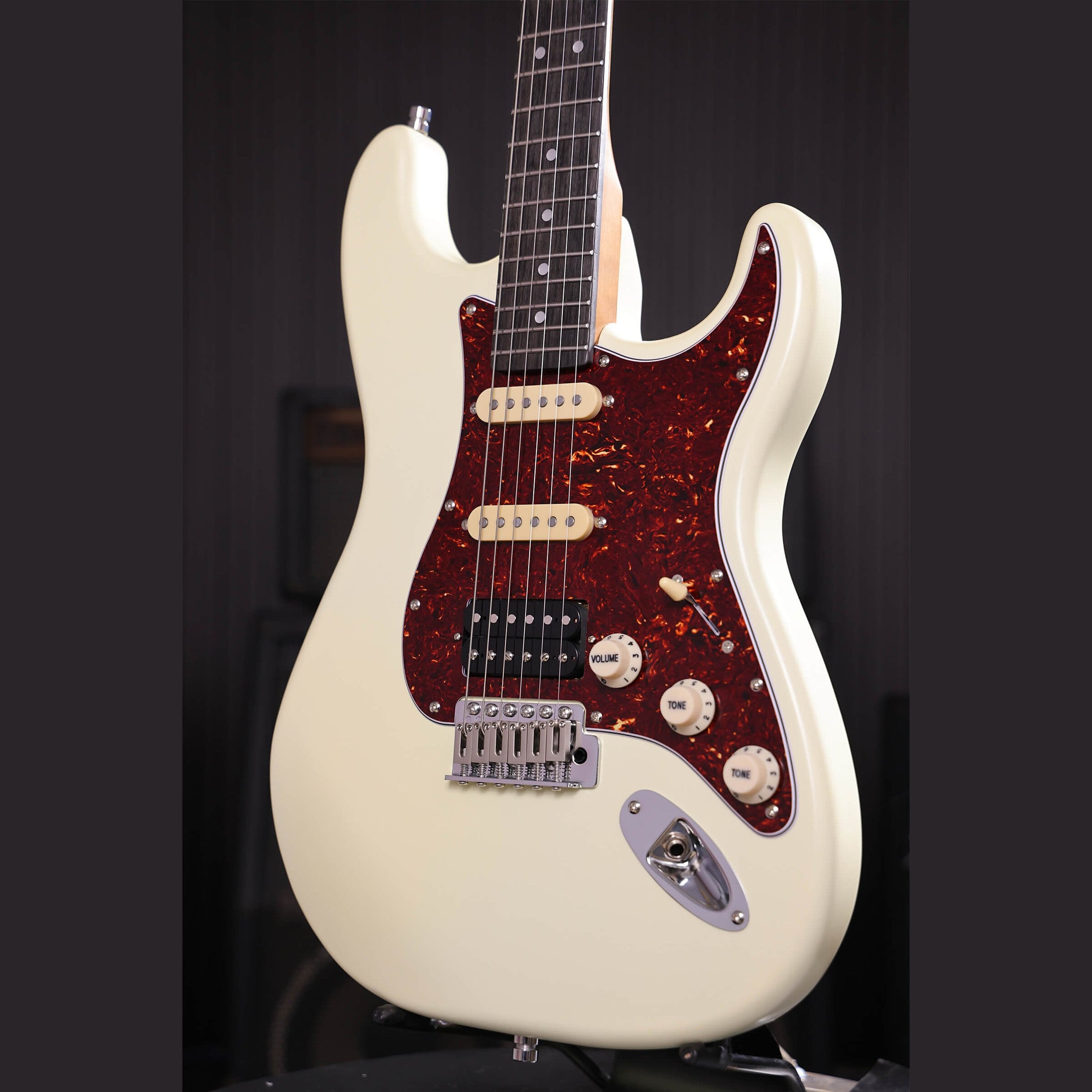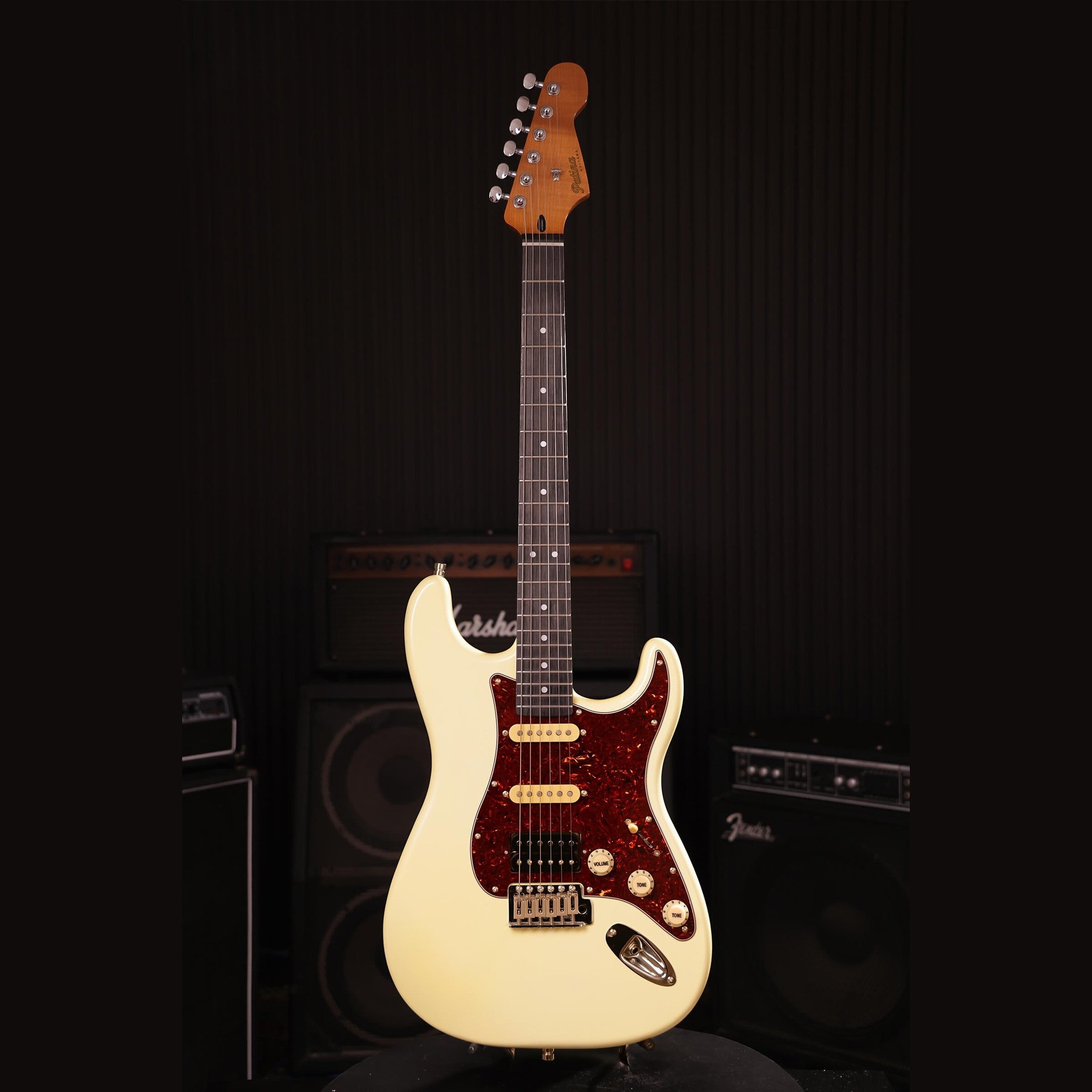 The Patina PS-4 OW is an S-style electric guitar with a HSS pickup configuration that delivers both bright single-coil tones and powerful bridge tones. In the neck and middle positions, you get sparkling cleans and open chords. Switching to the humbucker in the bridge provides more output and a tight response for riffs and solos.