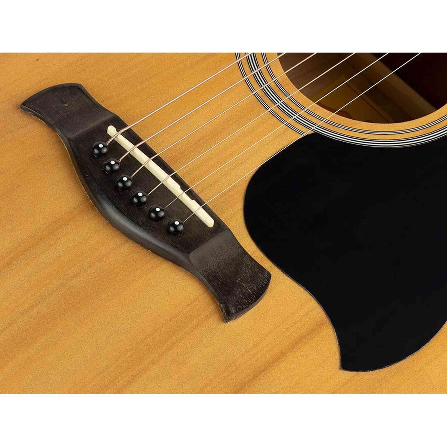The Richwood RD-12 in natural is an excellent starting point for any aspiring guitarist. This dreadnought guitar offers a comfortable playing experience thanks to its low string height and smooth finish. The spruce top provides bright projection, while the laminated basswood back and sides contribute to a warm, balanced tone. With oil-bath tuners, the RD-12 stays in tune well, even with regular use.